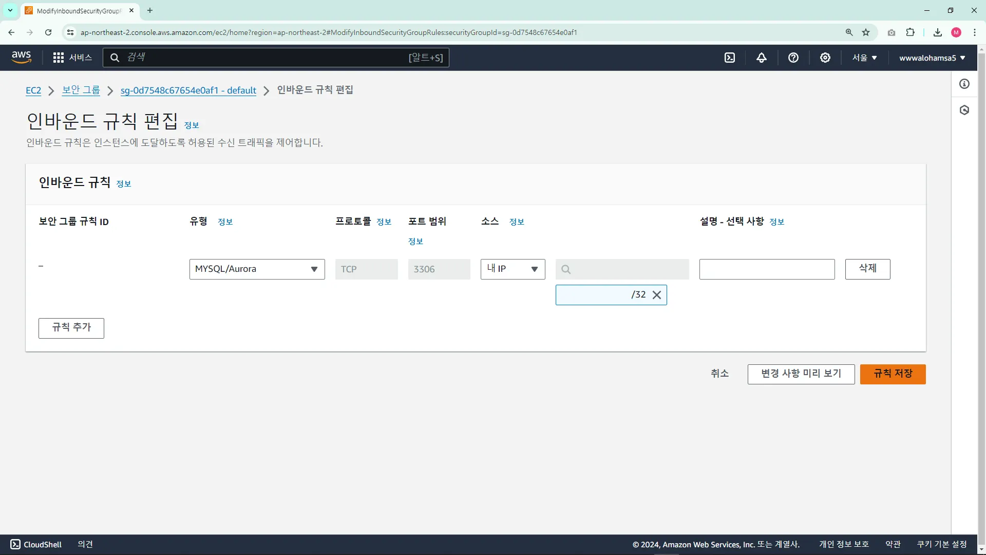 ์์ฑํ RDS ์ ๋ง๋ ์๋ก์ด ๋ณด์ ๊ทธ๋ฃน์ด ํ์ํ๋ฉด
