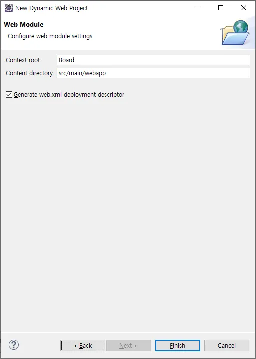 ๋๋ค. ์ด ํ๋ฉด์์๋ Context root ๊ทธ๋ฆฌ๊ณ Content directory๋ฅผ ์ค์ ํฉ๋๋ค. ๋ํ web.xml ํ์ผ์ ์์ฑํ ์ง ์ฌ๋ถ๋ฅผ ์ฒดํฌํ ์ ์์ต๋๋ค.