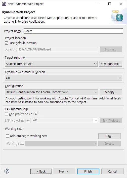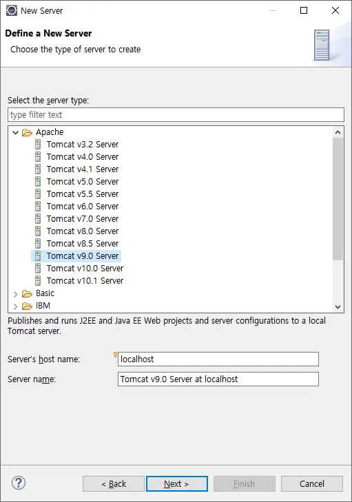 ์๋ฒ ๋ฐ ๋ฒ์ ์ ์ ํํฉ๋๋ค. ์ฌ๊ธฐ์๋ Tomcat v.9.0 ์ ์ฌ์ฉํ๊ฒ ์ต๋๋ค.
