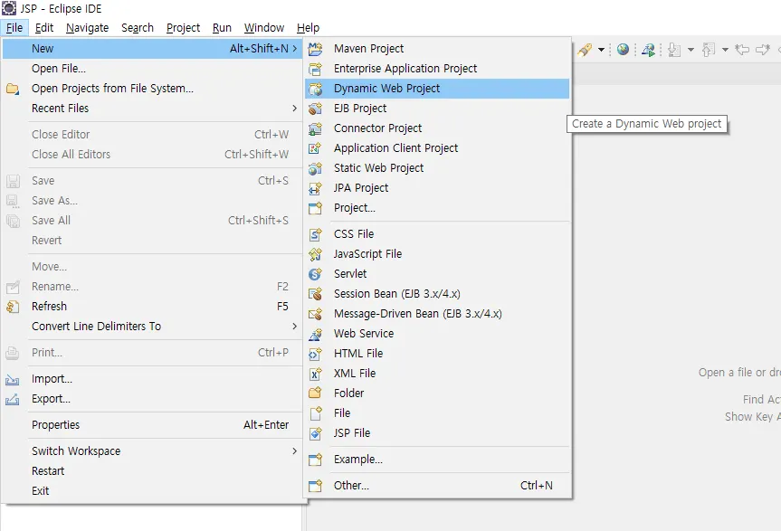 ์ดํด๋ฆฝ์ค๋ฅผ ์คํํด์ [File] ๋ฉ๋ด์ [New] ๋ฉ๋ด๋ก ๋ค์ด๊ฐ์ Dynamic Web Project ๋ฅผ ์ ํํ๋๋ก ํ๊ฒ ์ต๋๋ค.