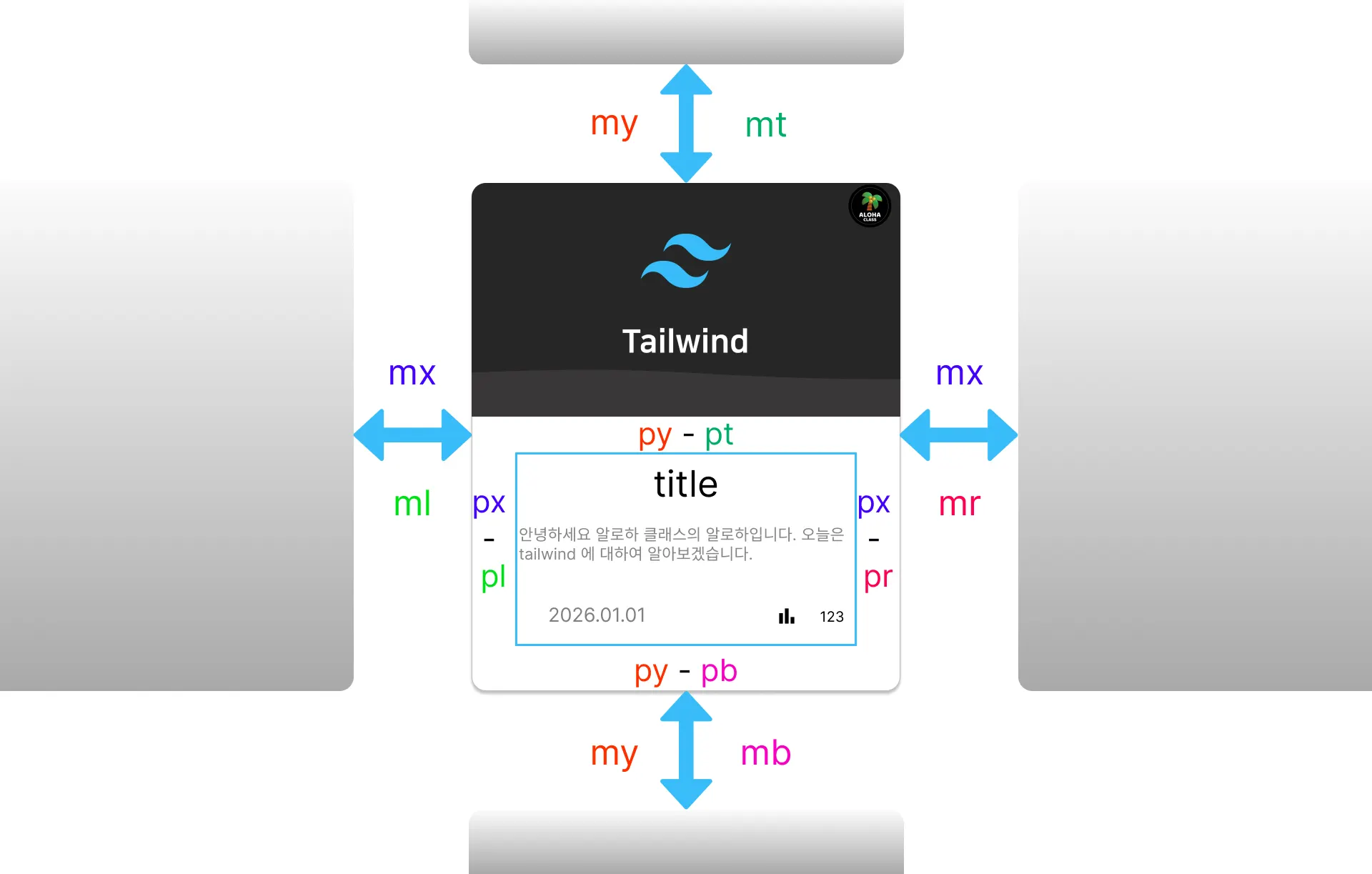 tailwind ์์ margin ๊ณผ padding ์ ์(top), ํ(bottom), ์ข(left), ์ฐ(right) ๋ค ๋ฐฉํฅ์ผ๋ก ์ง์ ํ ์ ์์ต๋๋ค. ๋ํ x์ถ(์ข, ์ฐ), y์ถ(์, ํ)์ ๋ฌถ์ด์ ์ง์ ํ๊ฑฐ๋ ๋ค ๋ฐฉํฅ ์ ๋ถ๋ฅผ ์ง์ ํ ์ ์์ต๋๋ค.