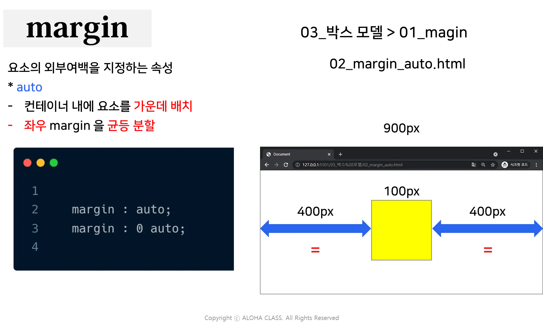 ๋ธ๋ก ์์์์ margin-left์ margin-right๋ฅผ auto๋ก ์ค์ ํ๋ฉด ๊ฐ๋ก ํญ์ด ์๋ ์์๋ฅผ ๊ฐ์ด๋ฐ ์ ๋ ฌํ ์ ์์ต๋๋ค.